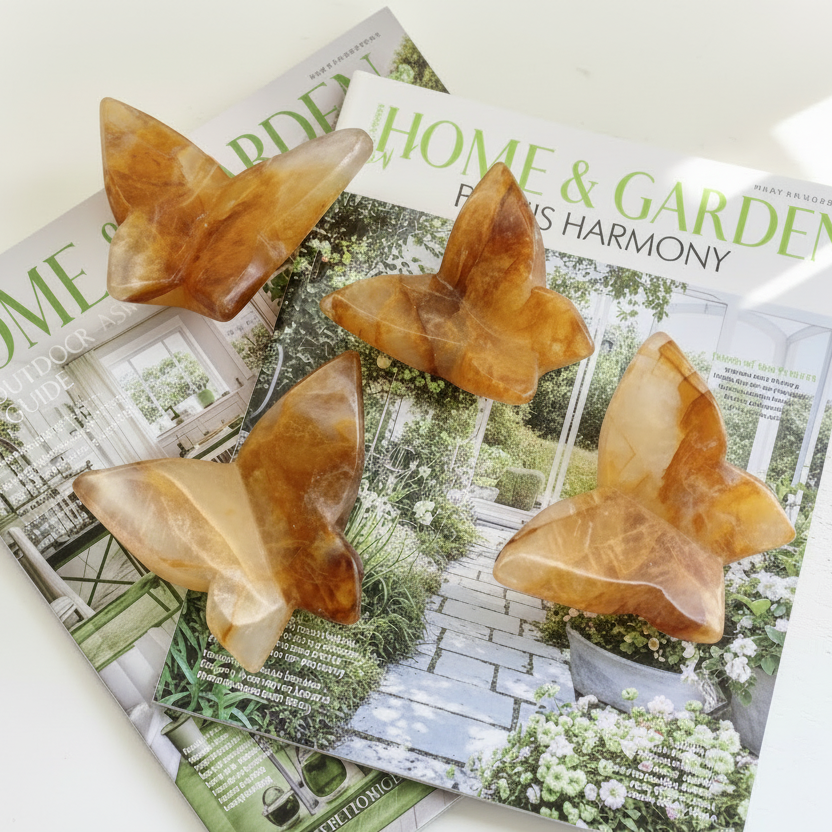 These sweet little Golden Healer Butterflies are hand-carved from natural Golden Healer Quartz, glowing with that soft, warm golden hue and gentle iron inclusions that catch the light just right.